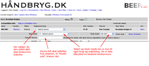 - Indtast opskriften, så præcis som muligt. Selve opskriften er ikke tilgængelig for dommerne, men kan offentliggøres, såfremt øllet vinder i konkurrencen. Bemærk at du skal vælge en stilart til din øl, der bruges af BeerCalc til at kategorisere din øl. Denne valgte stilart kan være forskellig fra den, der bruges til en konkurrence - se nedenfor.